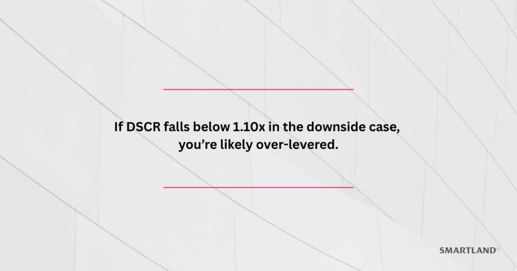 Start with DSCR in base and downside cases. Confirm that the exit and prepayment rules align.