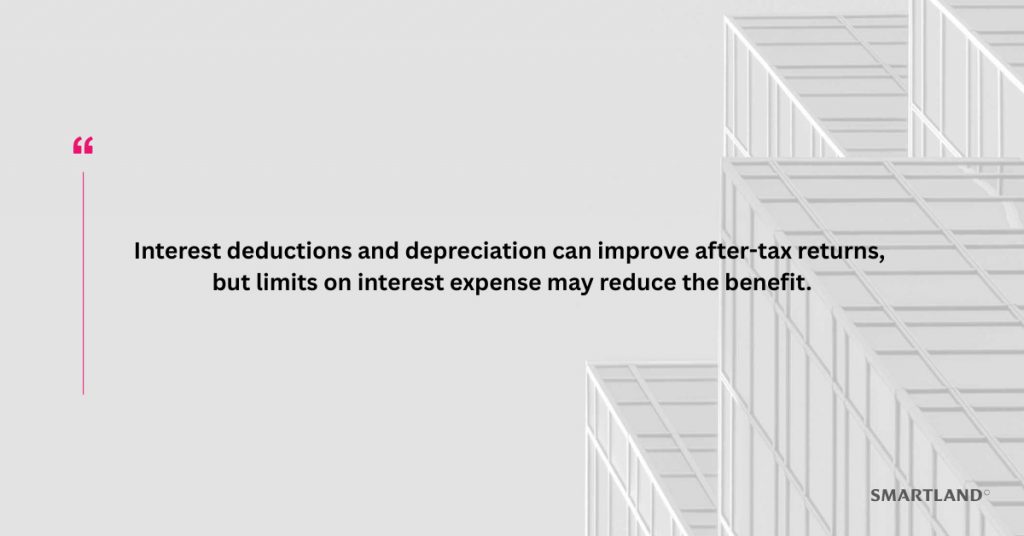 Interest is often deductible. Interest limits can cap the benefit. Depreciation can increase after tax cash flow. Entity choice affects how taxes pass through.