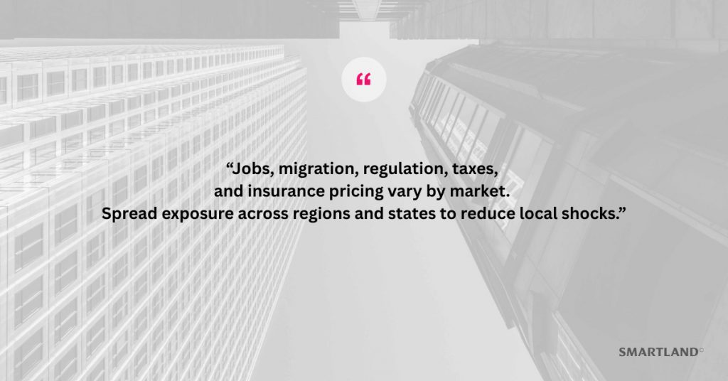 Jobs, migration, regulation, taxes, and insurance pricing vary by market. Spread exposure across regions and states to reduce local shocks. Set limits and rebalance as values change.